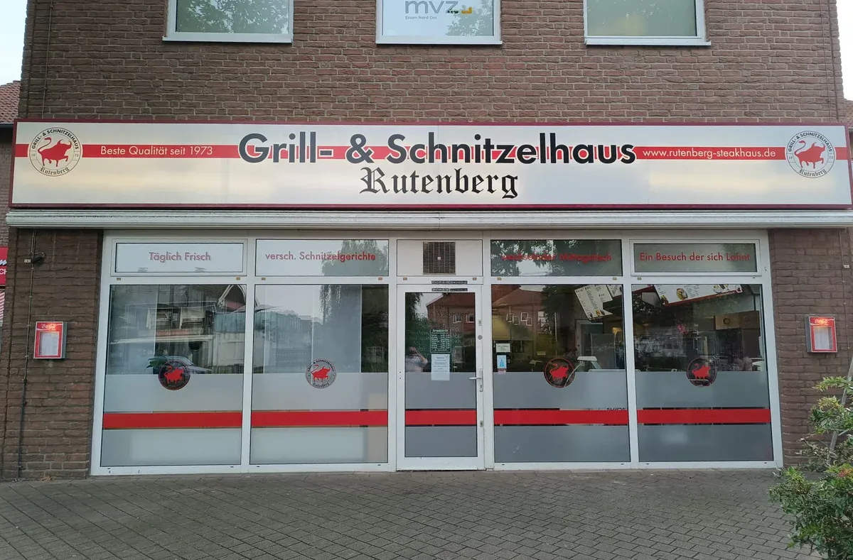 Fassade eines Grill- & Schnitzelhauses mit Rutenberg-Steakhaus Logo.