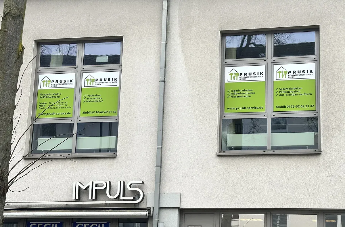 Werbeaufkleber für Renovierungsservice mit Kontaktinformationen und Leistungsangebot an Bürofenstern.