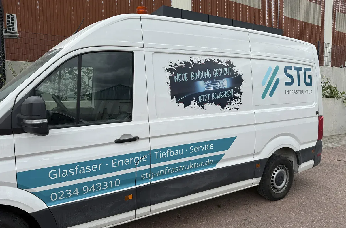 Moderne Fahrzeugbeschriftung für STG Infrastruktur mit Fokus auf Glasfaser- und Energiedienstleistungen.