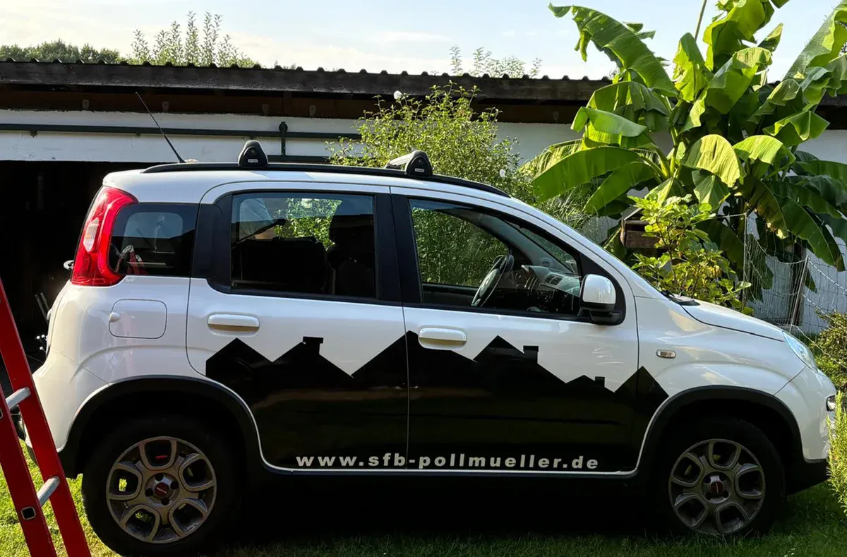 Auto mit Mountain-Landschafts-Grafik, Werbung für SFB Pollmueller, umweltfreundliche Firmenmobilität, nachhaltige Fahrzeugwerbung.